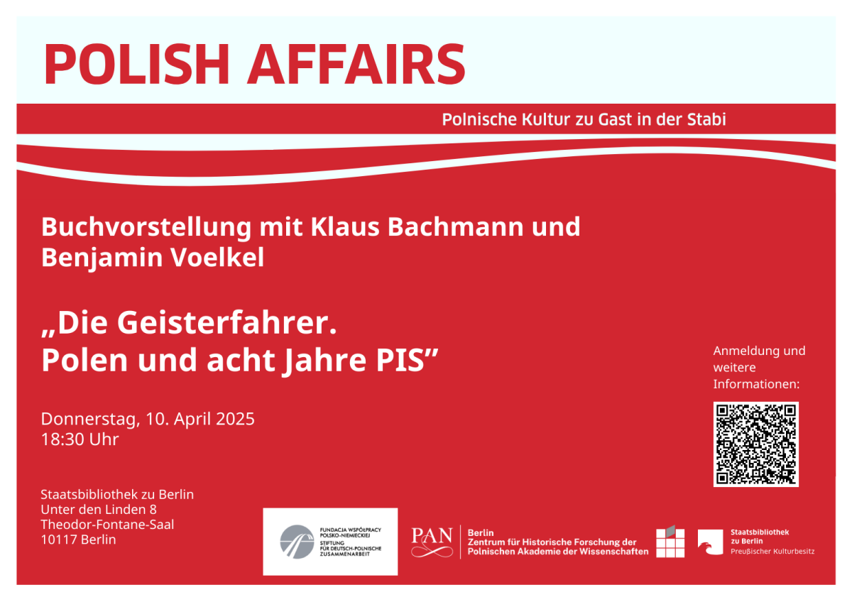Die Veranstaltungsreihe „Polish Affairs. Polnische Kultur zu Gast in der Stabi“ bietet in Gesprächen mit Autor:innen, Wissenschaftler:innen und Übersetzer:innen tiefe Einblicke und intensiven Austausch rund um Polen und polnische Publikationen. Das Programm reicht von historischen Themen über Biografien und Reportagen bis zu polnischer Literatur.