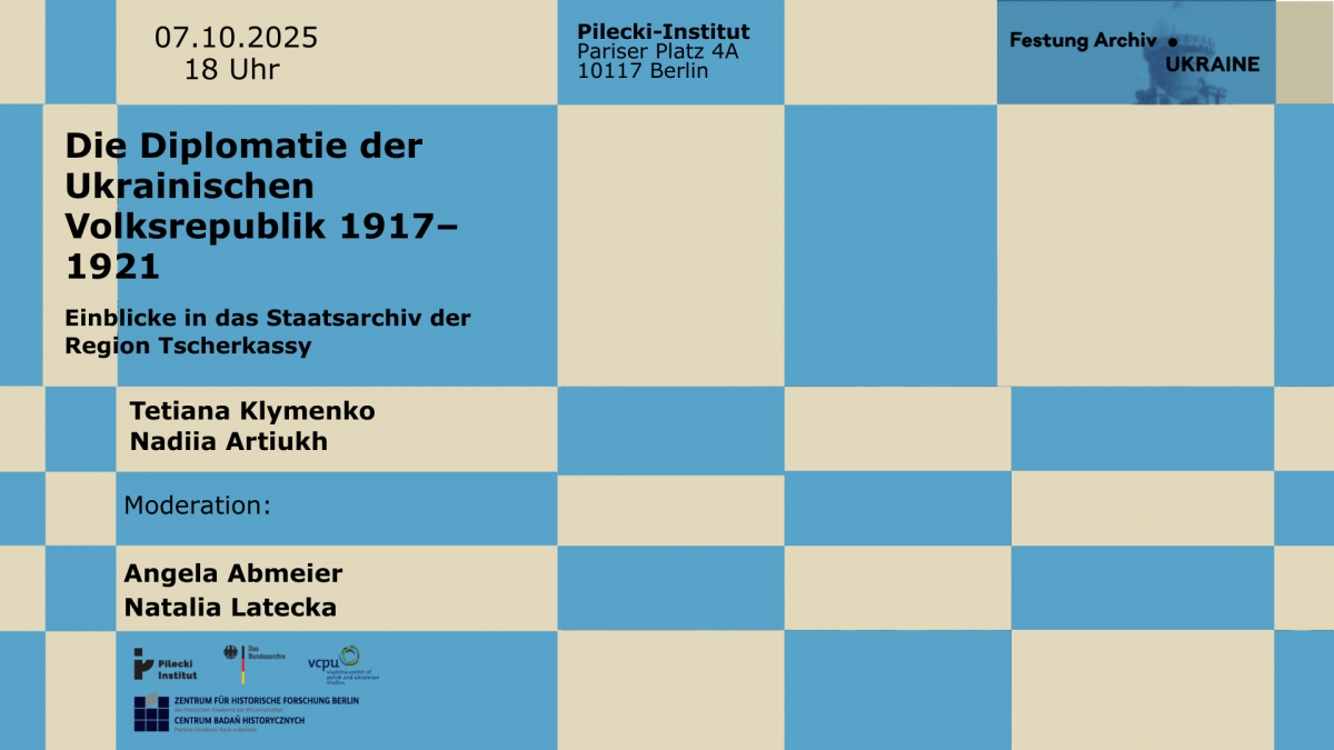 Viel zu wenig bekannt und doch von großer Bedeutung für die heutige ukrainische Identität: die Geschichte der Ukrainischen Volksrepublik 1917–1921. Wir freuen uns, dieses Thema im Rahmen unserer Reihe Festung Archiv Ukraine aufzugreifen. Wie immer laden wir Archivarinnen und Archivare aus der Ukraine ein, um über ihre Bestände und die Geschichte ihrer Archive zu berichten. Die Veranstaltung wird aus dem Ukrainischen simultan ins Deutsche übersetzt - zwei Tage später gibt es auch noch die Möglichkeit, an einem wissenschaftlichen Seminar auf Polnisch und Ukrainisch im Zentrum für Historische Forschung Berlin der Polnischen Akademie der Wissenschaften teilzunehmen.